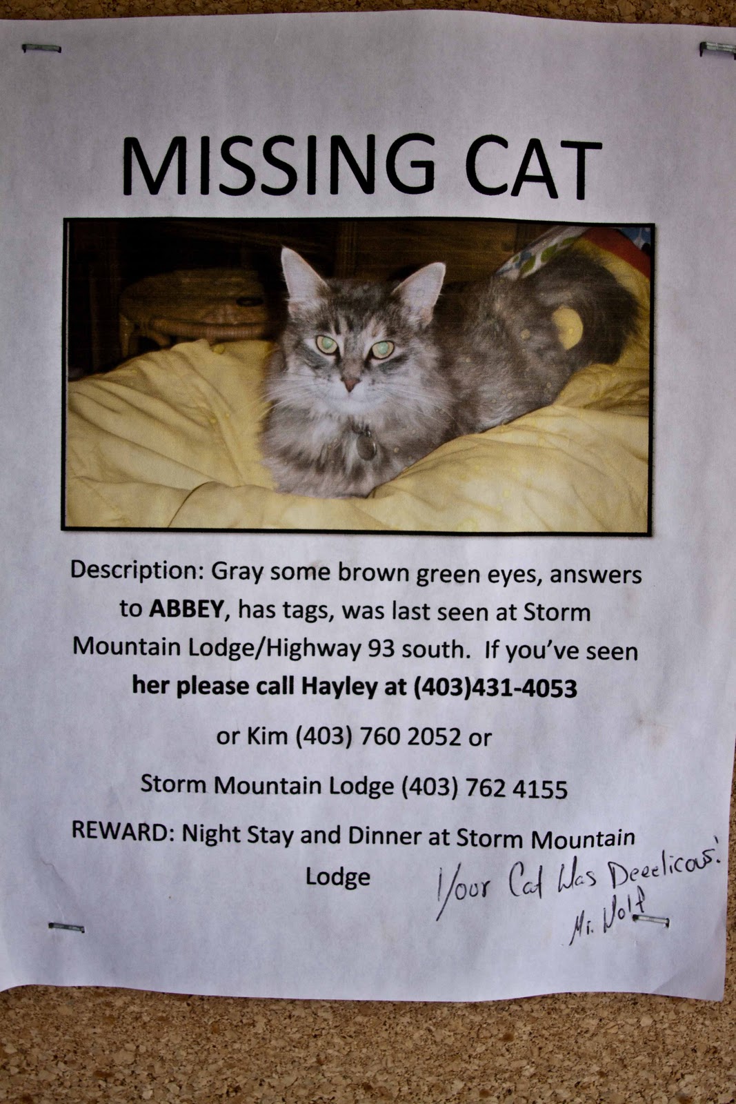 This hike was another impressive hike through a canyon. We dodged the raindrops and were treated to a very scenic hike. On the way back to the car, Chrissy noticed a missing cat poster on a message board at the parking lot. She was laughing and insisted I read it. But I didn't want to stop because I was heading to the bathroom to take a piss. She insisted so I did. When I read the sign pictured below, I was laughing so hard I almost pissed myself.