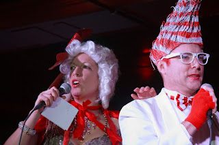 Dominatrix Santa with Bondage Santa on the chimney at the back of the stage.
